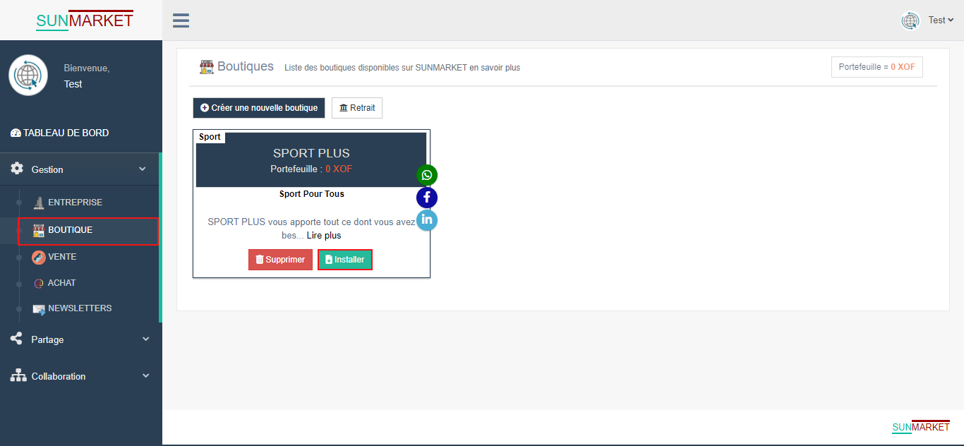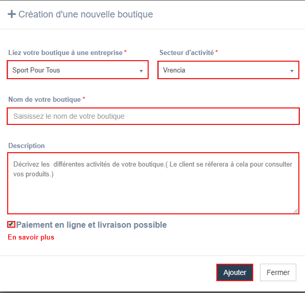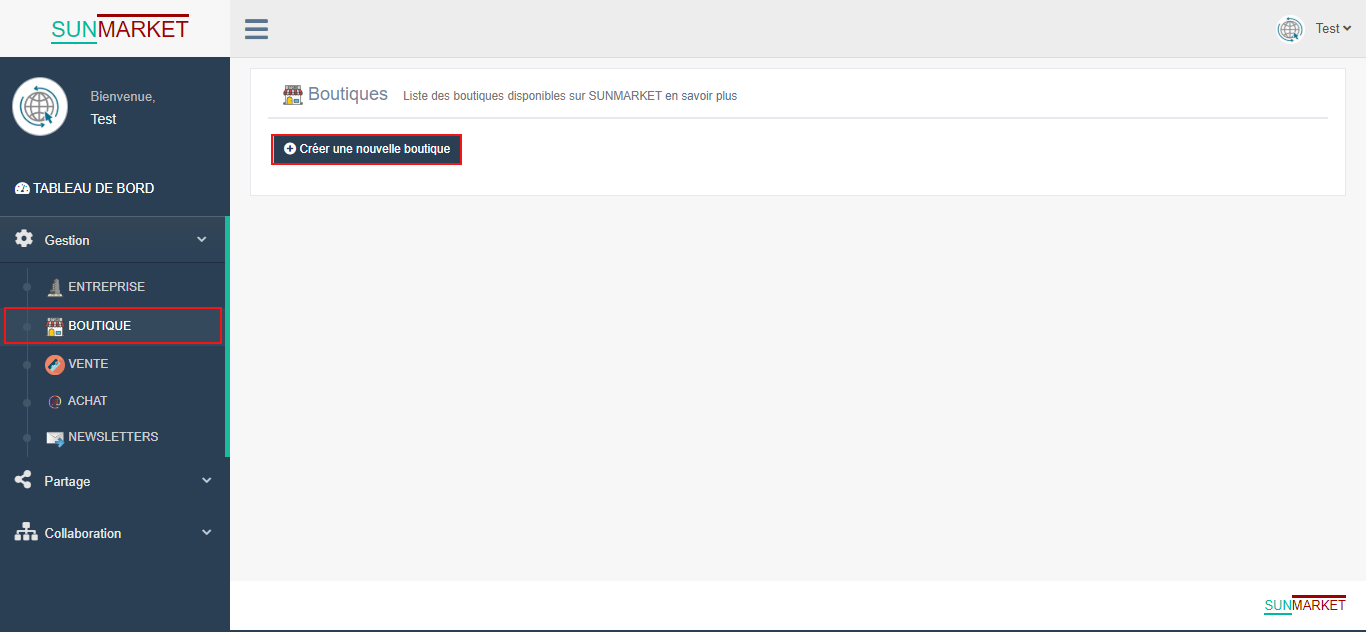 Cliquez sur le boutton Créer une nouvelle boutique , remplissez les champs demandés puis validez pour enrégistrer la boutique.