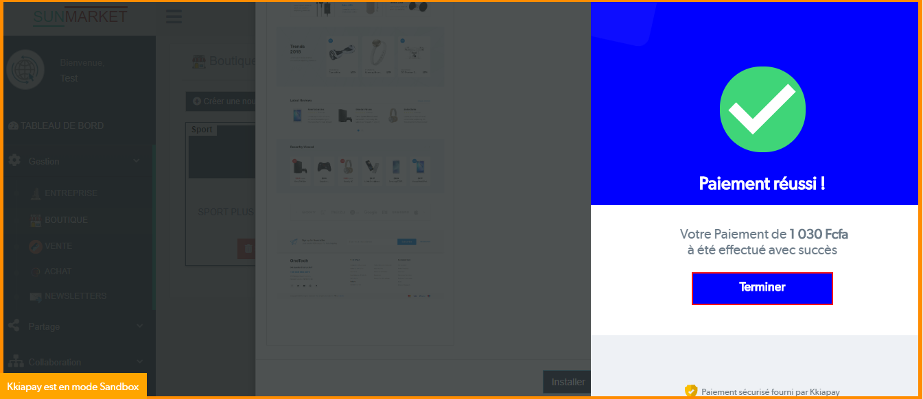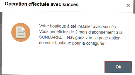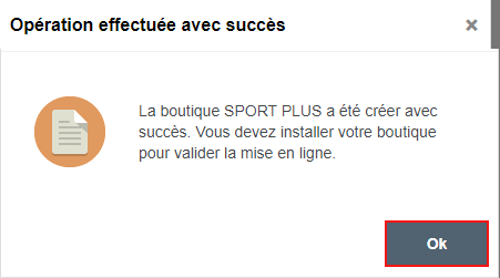 Une fois valider, un message apparaitra vous spécifiant d'installer votre boutique avant de continuer