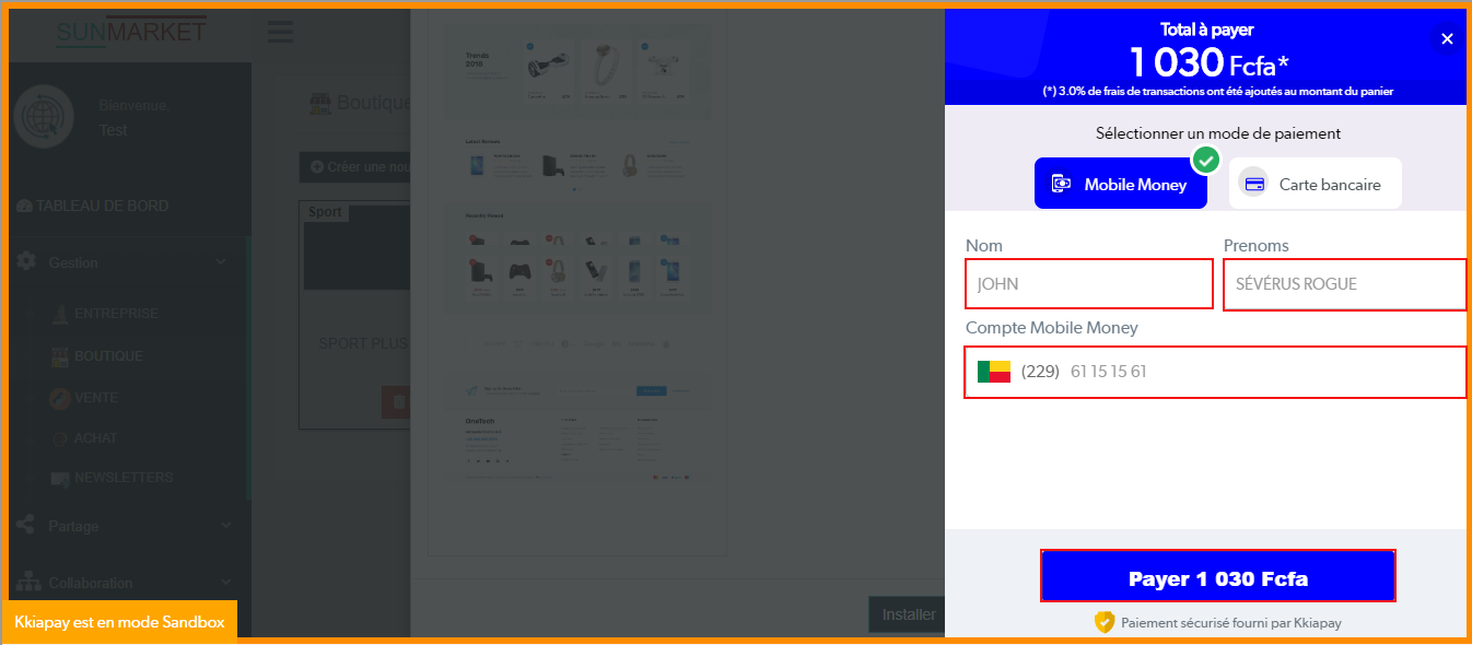 Vous êtes redirigé vers une page de paiement ou vous devez payer la somme de 1000 Fcfa. Vous pouvez choisir de payer par mobile money ou par carte bancaire (visa). puis suivez les étapes pour valider le paiement.